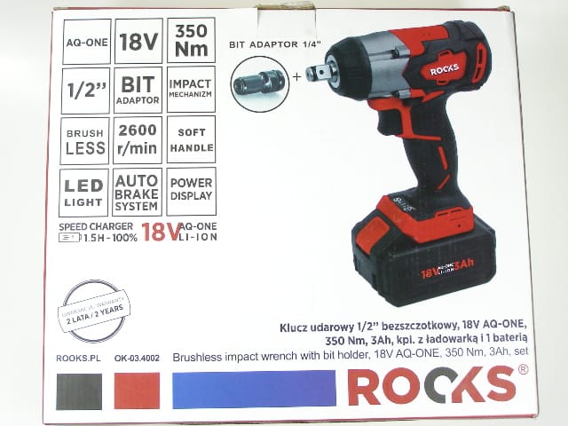 Akumulatorowy Klucz Udarowy 1/2″ 350 Nm, Bezszczotkowy, 18V AQ-ONE, 3 Ah Kpl z ładowarką i 1 Baterią