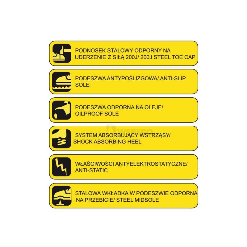 Trzewiki bezpieczne model T1A to buty w klasie ochrony S1P. Wierzch obuwia wykonano z mocnej i odpornej na przetarcia skóry. Przed urazem palców chroni użytkownika stalowy podnosek, wytrzymujący uderzenie z energią 200J. Podeszwa wykonana została z dwugęstościowego poliuretanu. Wewnątrz buta znajduje się stalowa wkładka antyprzebiciowa. Dodatkowo podeszwa posiada właściwośći antyelektrostatyczne. Część piętowa dodatkowo absorbuje energię podczas chodzenia co przekłada się na komfort użytkowania. Podeszwa odporna na oleje oraz na poślizg na podłożu ceramicznym oraz stalowym.Warunki_GwarancjiCechy: